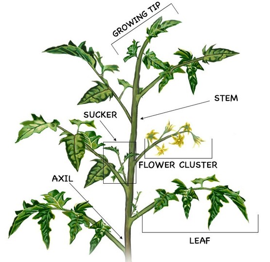 Then comes the pruning. My oh my – a hard game to keep up with. Tomatoes are a vigorously growing vine and the more vines they send out, the less energy they have to produce fruit. It’s the farmer’s job to keep the tomatoes focused on producing fruit on a singular vine all season long by removing any side vines they try to send out…we call these “suckers.” See the image below to see what I mean. Having a singular vine also keeps the plant compact and tidy, preventing the spread of any disease from plant to plant.