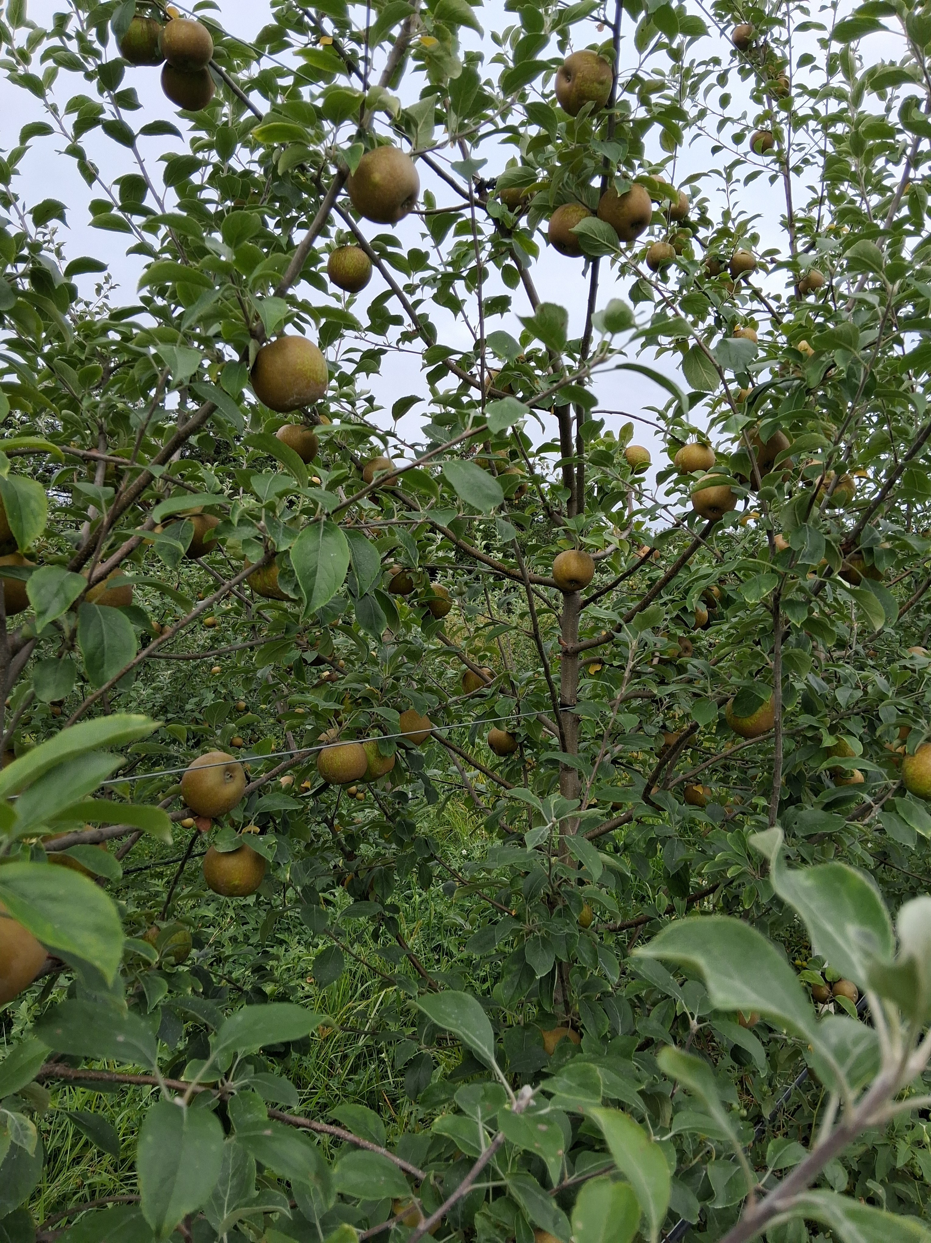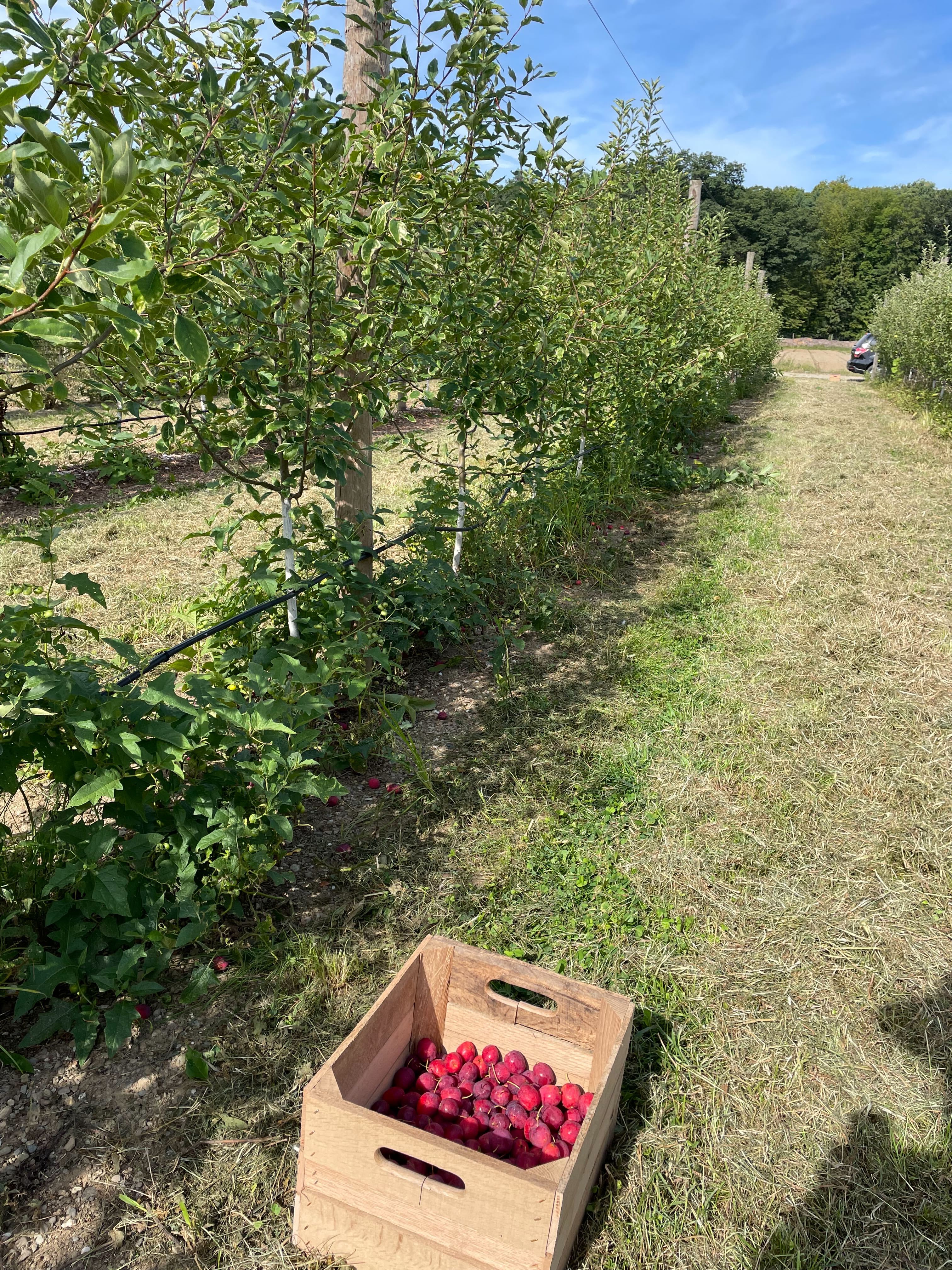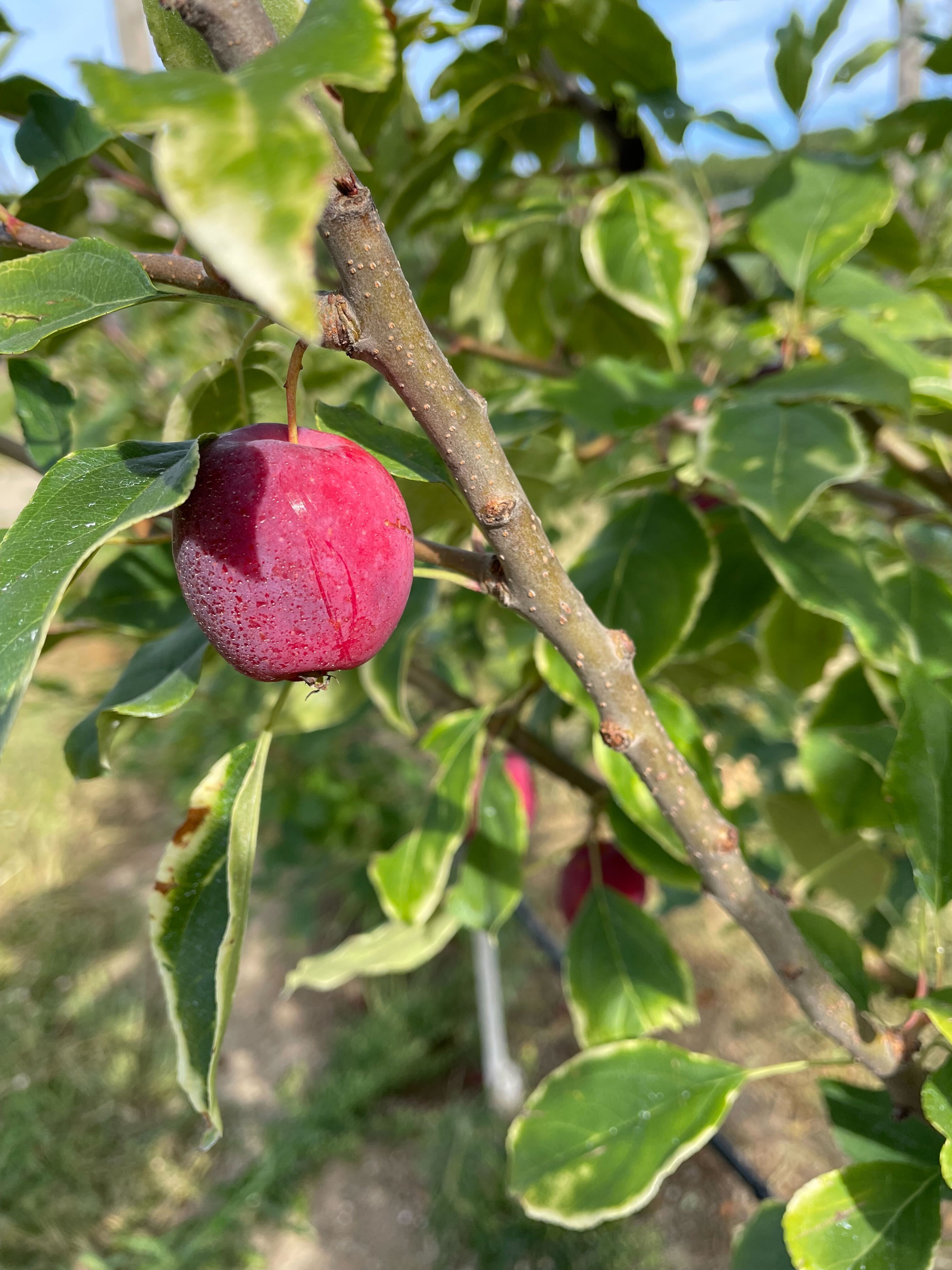 Back in 2022 we planted the first apple trees of our orchard and over the past 3 seasons they have been tended, pruned, weeded, protected with care and consideration in preparation for this upcoming most important season of their lives: First fruit! Timing of apple harvest is all subject to starch content. Above you can see a first round of starch testing that has been done using iodine; the blacker the apple the higher the starch content…not quite ready for picking… “about 3 weeks away” says our orchardist. With 5 acres and 13 varieties to harvest this season – we’ve harvested one variety so far called, “Dolgo” – a crab apple. The plan for all of these apples? We’ll be taking a load up to the Catskills to be made into hard cider this winter. 2 blends are on the schedule for pressing and processing and should be ready for consumption late Spring of 2026. For this season, we’ll have some apples for sampling, buying and eating at all of our markets and we’ll have a soft (non-alcoholic) cider hitting the farm store later this fall.