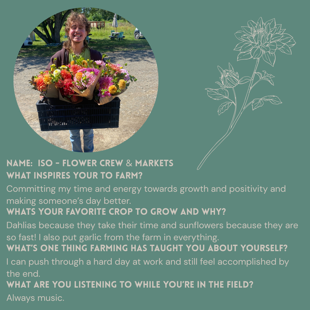 This month we want to introduce you to the awesome team of flower farmers who have been bringing you beautiful blooms all season long! I think flower farming gets a reputation for being sweet, gentle and delicate work – just like a flower. What people don’t know is that the flowers we grow and farmers that tend them are a lot tougher than you might assume. Toting buckets of heavy flowers around and building up the calluses of constantly stripping flowers is the least of it! Being a no-till farming operation, this team executes a lot of heavy manual labor tasks beyond harvest. They are constantly laying compost and wood chips by hand and wheelbarrow, pulling out old crops and weeds on hand and knee, moving around full crates of tubers and bulbs, and dragging wet heavy tarps and 30 lb sandbags around – the list goes on. They cultivate and nurture field born beauty but are sweaty and covered in dirt by the end of each day. A sharp eye for detail running parallel to speed and strength is is absolutely necessary when sharing flowers with designers and customers who expect the best, abundant, long lasting, fresh blooms and they have done the job well this season – we are so lucky to have them with us on this season’s journey.