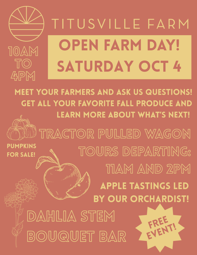 It’s been a beautiful 2 years of farmer’s markets, and opening the farm stand on site has gotten us closer to the community than ever before! We’ve been so lucky to have a great team of market and farm stand staff to answer your questions and share farm news with you over the seasons but are ready and excited to now host our first open farm day! All of our farmers will be on-site to answer questions, chat about what we do and talk about where things are headed! We’ll have two hay wagon farm tours departing at 11am and 2pm, heirloom apple tasting, a flower bar and fall produce aplenty. We hope mother nature blesses us with a beautiful fall day and encourage you to bring a blanket and picnic – enjoy the ambiance of fall on the farm!